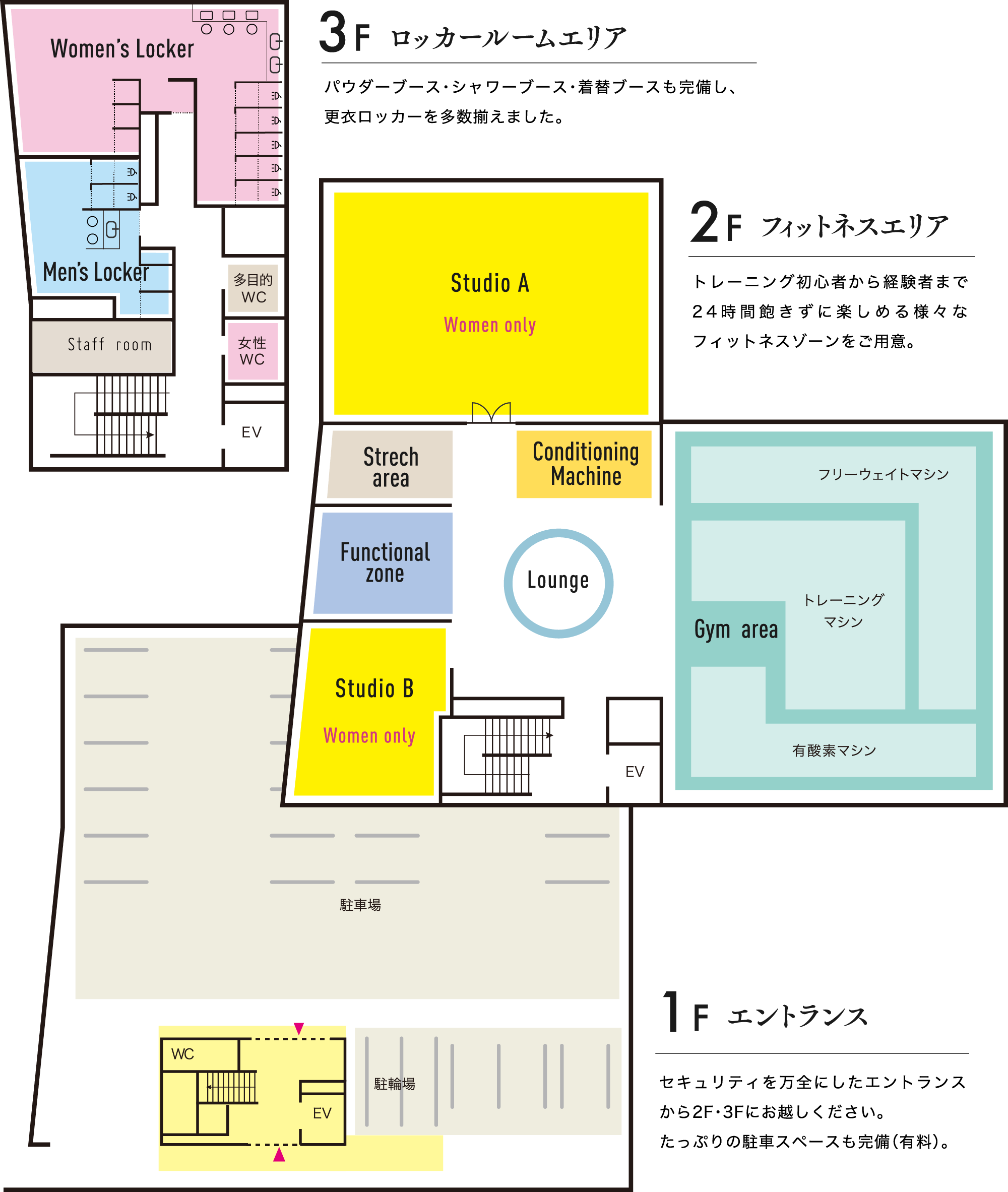 男女ロッカールーム内にロッカー・更衣室・シャワールームをそれぞれ完備しております。